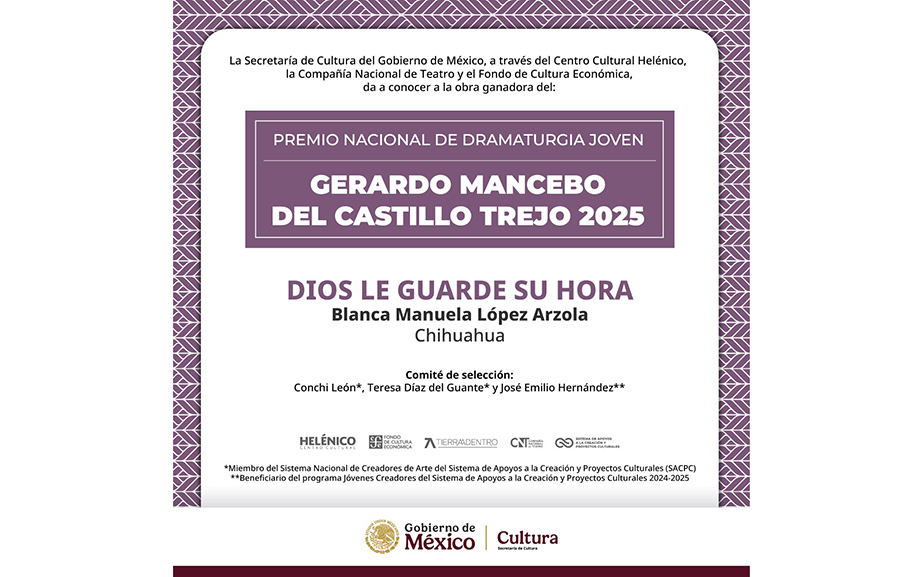 La Secretaría de Cultura del Gobierno de México, a través del Centro Cultural Helénico y la Compañía Nacional de Teatro, y el Fondo de Cultura Económica anuncian que Blanca Manuela López Arzola –escritora nacida en Chihuahua–es la ganadora del Premio Nacional de Dramaturgia Joven Gerardo Mancebo del Castillo Trejo 2025 por su obra: Dios le guarde su hora.