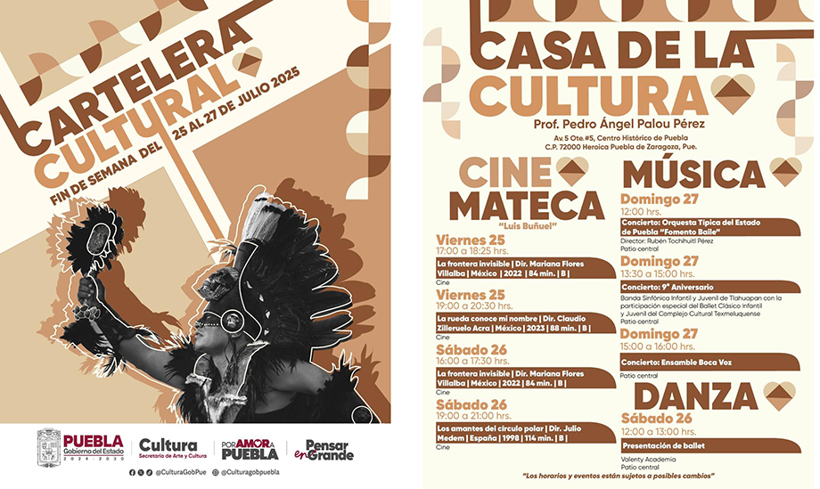 Por otro lado, la Cinemateca “Luis Buñuel” proyectará las cintas “La frontera invisible”, “La rueda conoce mi nombre” y “Los amantes del círculo polar”. La programación está disponible en la cartelera de fin de semana, publicada en las redes sociales de la Secretaría de Arte y Cultura: Facebook (Secretaría de Cultura Puebla), X (@CulturaGobPue) e Instagram (@culturagobpuebla).