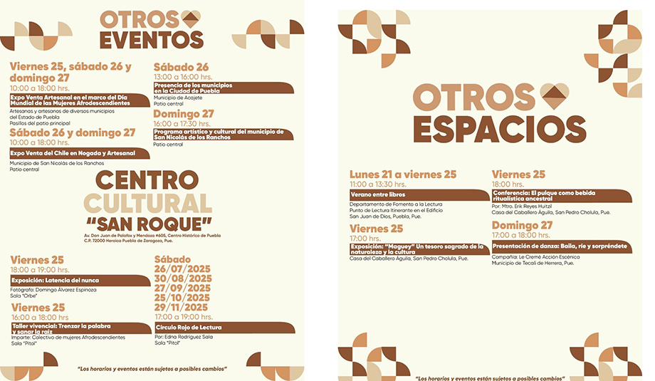 Entre los eventos programados por la Secretaría de Arte y Cultura, se incluye una expo venta artesanal en el marco del Día Mundial de las Mujeres Afrodescendientes, conmemorado el 25 de julio, en la que participarán artesanas y artesanos de diversas localidades del Estado de Puebla. Asimismo, el municipio de San Nicolás de los Ranchos expondrá y comercializará Chiles en Nogada y artesanías y desarrollará un programa artístico y cultural para las y los asistentes.