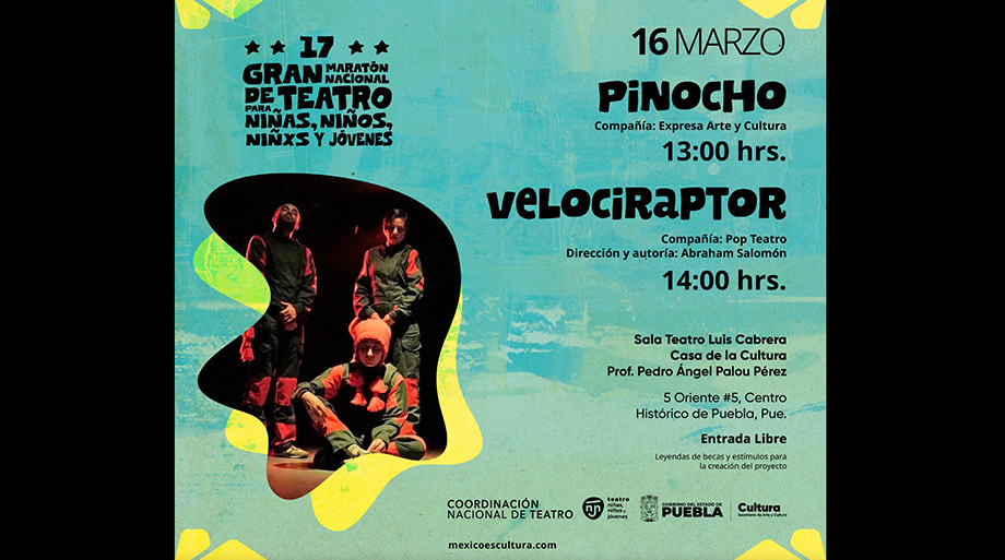 El domingo 16 de marzo, a las 13:00 horas, la compañía Expresa Arte y Cultura presentará la obra Pinocho; mientras que a las 14:00 horas, tendrá lugar Velociraptor, desarrollada por la compañía Pop Teatro bajo la dirección y autoría de Abraham Salomón. Ambas funciones serán presentadas en la Sala de Teatro «Luis Cabrera» del recinto.