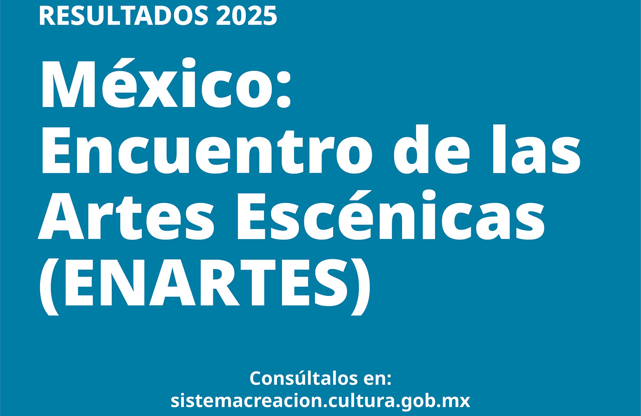 La Secretaría de Cultura del Gobierno de México, a través del Sistema Creación, da a conocer los resultados de la convocatoria “México: Encuentro de las Artes Escénicas (Enartes) 2025”, vertiente que tiene como objetivo la vinculación entre las y los creadores, fomentar sus habilidades de gestión y promoción artística-cultural, así como su capacitación en diseño de estrategias de promoción, difusión y producción para obras artísticas terminadas, dentro y fuera del país.