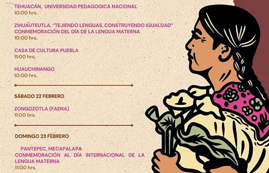 Por lo anterior, con el apoyo de autoridades municipales de Tlacotepec de Benito Juárez, Hueyapan, Tehuacán, Zihuateutla, Huauchinango, Zongozotla, Pantepec, Mecapalapa y Cuidad de Puebla, han organizado actividades en las distintas comunidades para dar salvedad, sentido y vivencias a los pueblos originarios, en la conmemoración del Día de la Lengua Madre los días del 20 al 23 de febrero, no te pierdas la programación.