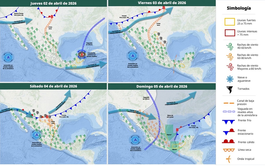 Igualmente, se espera que una línea seca sobre el norte del territorio nacional en combinación con la corriente en chorro subtropical provoque rachas de viento de hasta 80 km/h, además de probabilidad de formación de torbellinos en zonas de Coahuila y Nuevo León, por lo que se emiten precauciones.