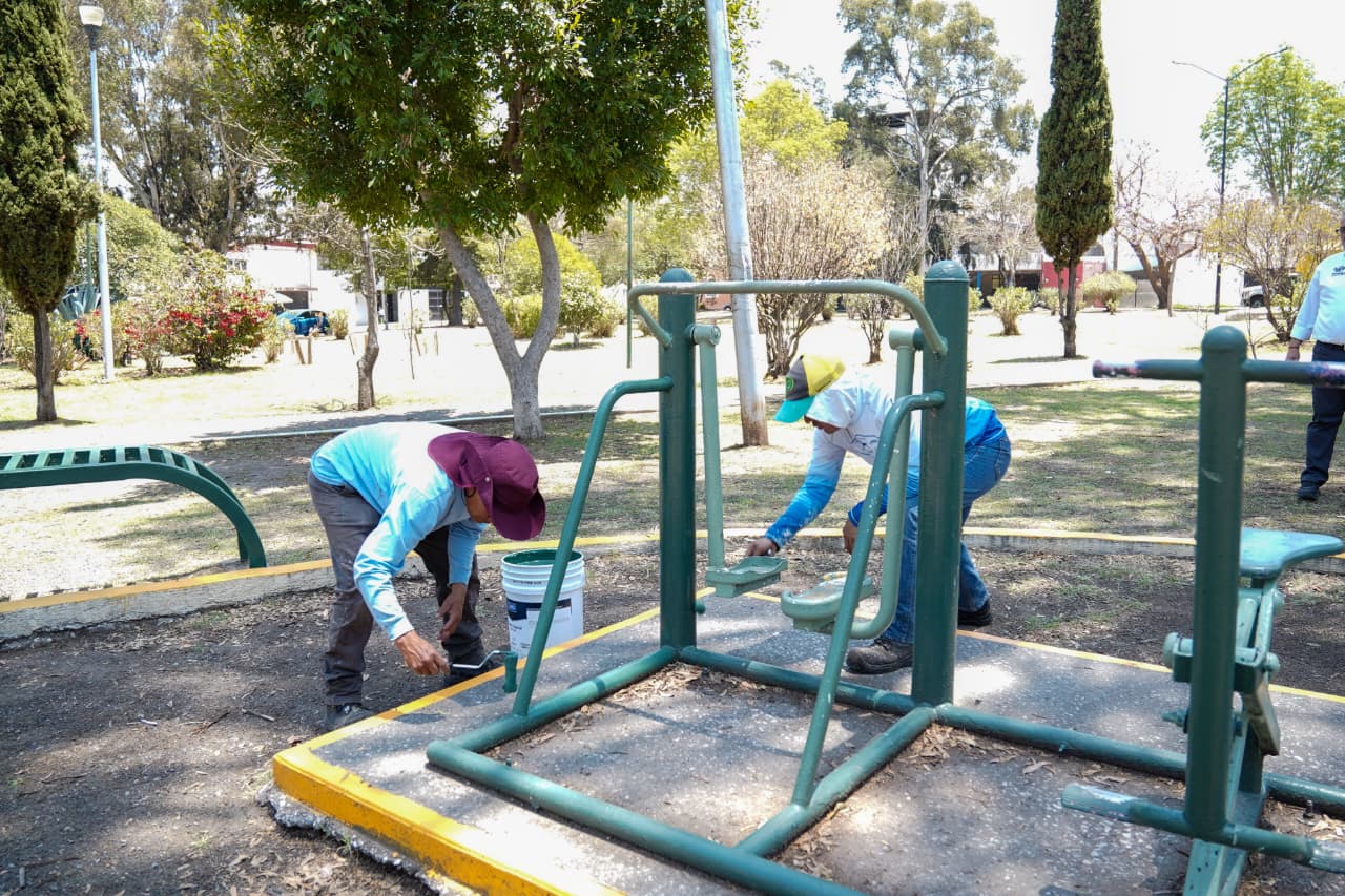 En la colonia Arboledas de Guadalupe, se realizaron labores de pintura en 11 ejercitadores, ocho bancas y cinco juegos infantiles, además de la reparación de un ejercitador y dos columpios, acciones que permiten garantizar instalaciones seguras y en buen estado para el uso de la ciudadanía.