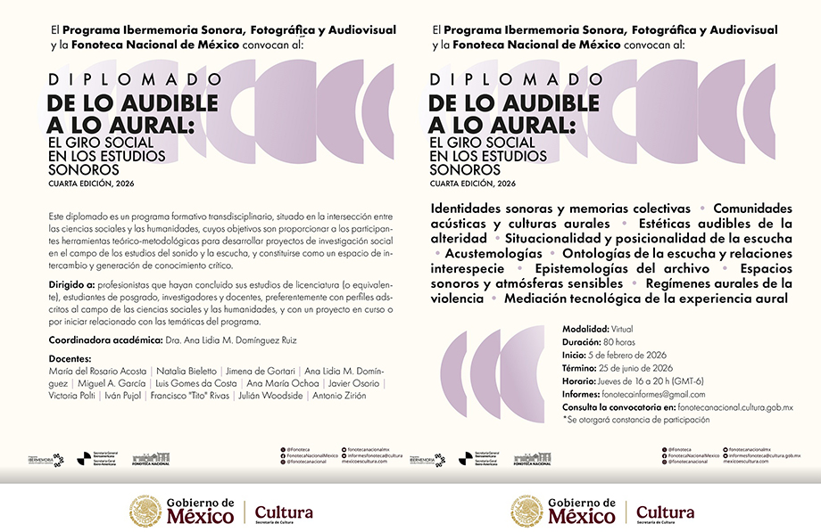 La Fonoteca Nacional, institución de la Secretaría de Cultura del Gobierno de México, y el Programa Ibermemoria Sonora, Fotográfica y Audiovisual convocan a participar en la cuarta edición del diplomado “De lo audible a lo aural: el giro social en los estudios sonoros”, un espacio académico que se orienta al análisis crítico del sonido y la escucha como fenómenos sociales, culturales y políticos.