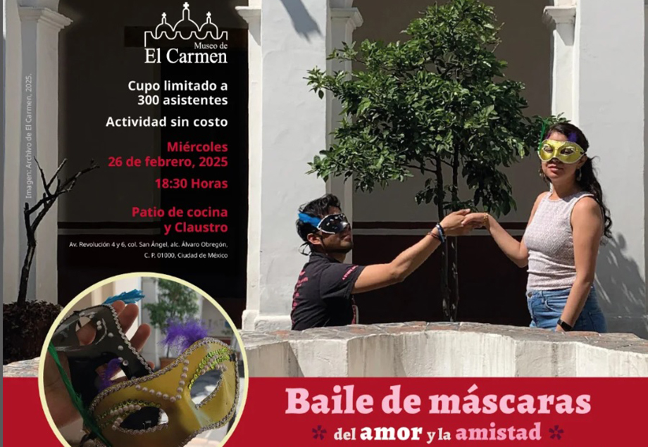 El Museo de El Carmen ofrecerá un Baile de Máscaras del Amor y la Amistad, en el que las y los asistentes participarán en una dinámica de encuentro cultural, acompañada por la música en vivo del grupo Sirena del Bosque. La velada se llevará a cabo en el Claustro y Patio de Cocina del recinto a partir de las 18:30 h, con un cupo para 300 personas. La recomendación es acudir con una máscara y, si lo desean, llevar sus propios alimentos para una experiencia más personalizada.