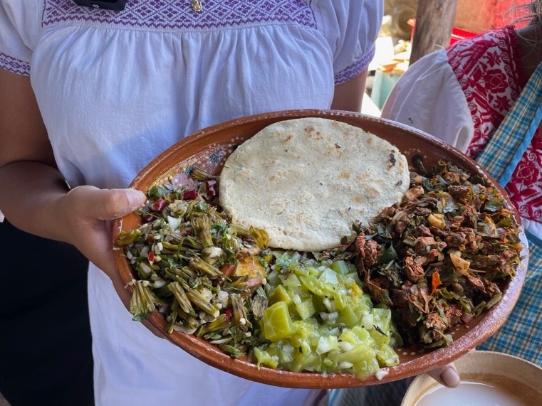 “Flores del cerro en penca con salsa de nopales”, de Cocineras Hñähñu de Maguey Blanco (Ixmiquilpan, Hidalgo)