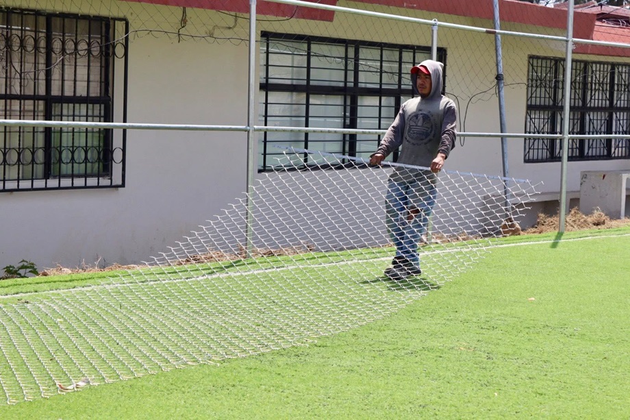 El trabajo —ejecutado por el área de Servicios Públicos Municipales— consiste en quitar la antigua malla que protegía las canchas de futbol para después colocar una nueva, lo que brinda mayor protección a los estudiantes al momento de practicar este deporte.