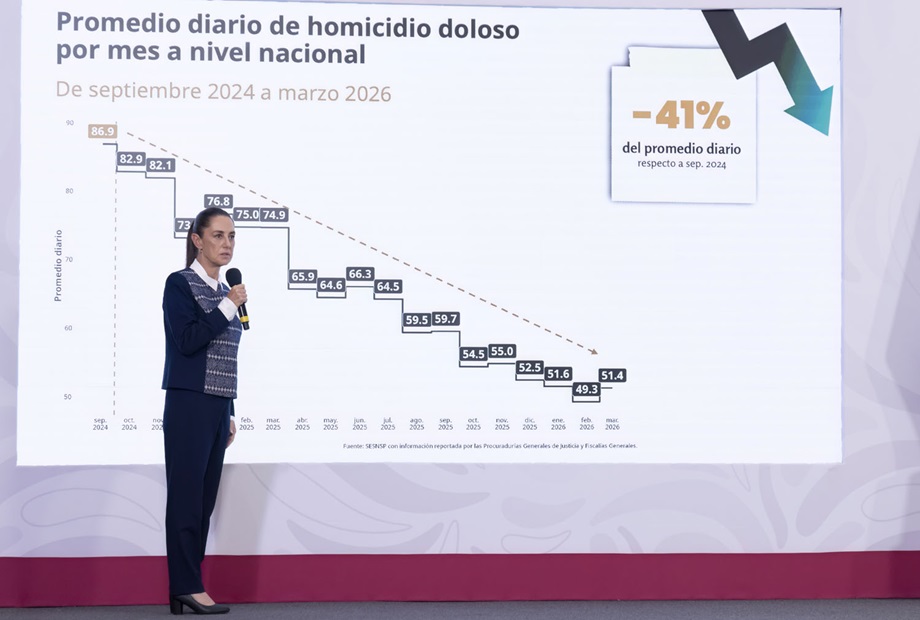 “En nuestro gobierno, con cifras preliminares a 2026, hemos reducido los homicidios dolosos del 2024, 91.7 al 2026 en 50.8 diarios, una reducción del 45 por ciento. Es decir, seguimos trabajando y hay que trabajar más, pero la Estrategia está dando resultados”, puntualizó en la conferencia matutina: “Las mañaneras del pueblo”.