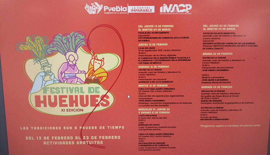 El Gobierno de la ciudad de Puebla, a través del Instituto Municipal de Arte y Cultura, presenta la XI edición el Festival de Huehues “Las tradiciones son aprueba del tiempo”, del 13 al 23 de febrero; las actividades son gratuitas y se llevarán a cabo en distintas sedes, conócelas en: pueblacapital.gob.mx/images/2024/imacp/galeria_IMACP.pdf